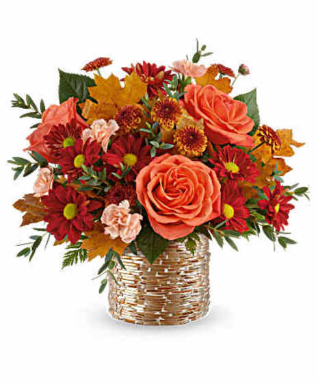 Teleflora's Chic Copper Bouquet includes orange roses, peach miniature carnations, bronze button and daisy spray chrysanthemums, parvifolia eucalyptus, leatherleaf fern, and preserved oak leaves in Teleflora's Chic Copper Vase