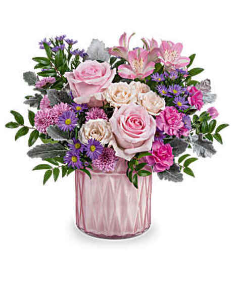 Add a touch of elegance to any space with Teleflora's Dazzling Gem Bouquet, a stunning arrangement of pink and purple blooms. Designed in a pink pearlescent vase that shimmers with timeless beauty, this radiant centerpiece is a gift to be cherished for years to come.Teleflora's Dazzling Gem Bouquet features a gorgeous mix of pink roses, crème spray roses, pink alstroemeria, hot pink miniature carnations, lavender button spray chrysanthemums, large purple Monte Cassino asters, dusty miller, and huckleberry. Artfully arranged in a pink pearlescent vase, it's a radiant and timeless gift.