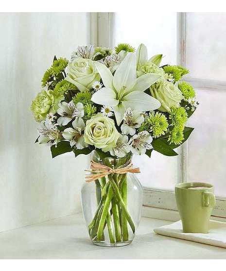 This beautiful green and white assortment is mixed with white roses, white lilies, green carnations and white alstroemeria. A vase that will surely be a hit for any St. Patrick’s Day festivity.