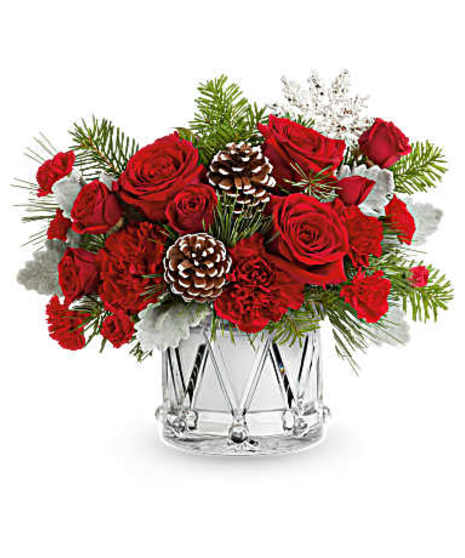 Teleflora's March of Joy Bouquet features red spray roses, red carnations, and red miniature carnations. Accented with dusty miller, noble fir, white pine, and pinecones in Teleflora's Crystal Drum Vase