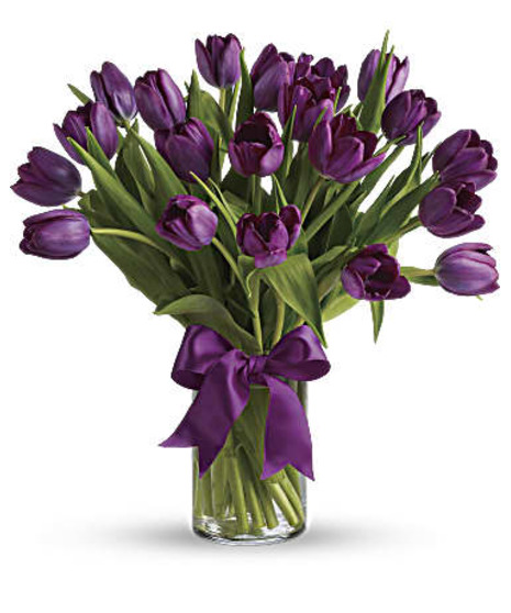 Tulips this tantalizing need no decoration! Celebrate a spring birthday, send your love, or simply let someone know you're thinking of them with this stunning monochrome bouquet. Presented in a clear cylinder vase, the minimalist gift appeals to purple-lovers, tulip-devotees and those with a more elegant and simple sense of style.