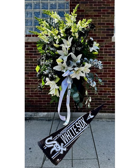 Losing a loved one is never easy but sending them off with the love of their favorite team soothes the soul. This standing easel is created with black, white and silver florals and a pennant from their favorite southside team. A sure-fire way for your loved one to always sing Let's go, go WHITE SOX