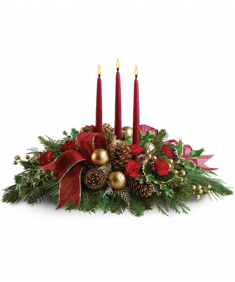 All will be bright this season when you order this joyful Christmas arrangement. A lovely centerpiece, it will light up the holiday festivities beautifully.